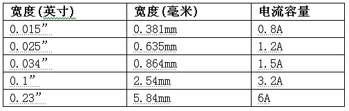 表1:外部跡線寬度與電流容量(20oC溫升)。