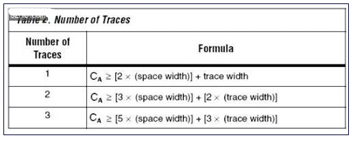 兩個(gè)過孔之間的區(qū)域被稱為走線通道。相鄰過孔焊盤之間的通道面積是信號(hào)布線必須經(jīng)過的小面積。表1用來計(jì)算可以經(jīng)過這個(gè)區(qū)域布線的走線數(shù)量。