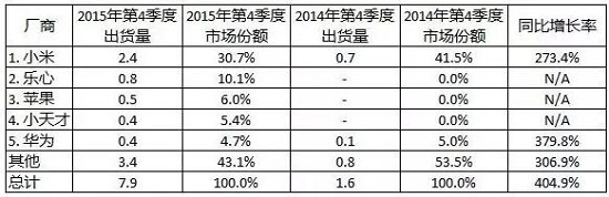 導(dǎo)致這一結(jié)果出現(xiàn)的原因主要是三種勢(shì)力的崛起,一種勢(shì)力當(dāng)然是蘋(píng)果的,盡管Apple Watch發(fā)布后飽受非議,但蘋(píng)果品牌的巨大慣性依舊無(wú)人能比。二種勢(shì)力是小米的上升。2014年,小米的發(fā)貨量?jī)H有110萬(wàn)臺(tái),市場(chǎng)占有率為4%,但2015年小米市場(chǎng)占有率已經(jīng)達(dá)到15.4%,成為僅次于Fitbit榜上老二,而位于蘋(píng)果、Garmin和三星之前。