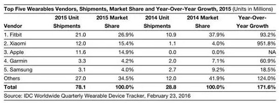 從全球市場(chǎng)看,一大變化是Fitbit的領(lǐng)頭羊地位被動(dòng)搖。盡管2015年Fitbit的發(fā)貨量增長(zhǎng)迅猛,銷(xiāo)售量增長(zhǎng)了93.2%。但卻大大落后于整個(gè)市場(chǎng)的爆發(fā)速度,這使得Fitbit的市場(chǎng)份額從2014年的37.9%下降至26.9%。