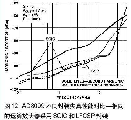 這種引腳排列還有一個好處就是降低了二次諧波失真。傳統運算放大器的引腳配置中引起二次諧波失真的一個原因是同相輸入和負電源引腳之間的耦合作用。LFCSP封裝的低失真引腳排列消除了這種耦合所以極大地降低了二次諧波失真;在有些情況下多可降低14 dB。圖12示出了AD80992 采用SOIC封裝和LFCSP封裝失真性能的差別。