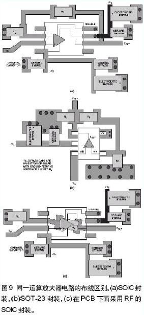 圖9示出了采用SOIC封裝(a)和SOT-23封裝(b)的運算放大器之間的布線區別。每種封裝都有它自身的一些問題。重點看(a),仔細觀察反饋路徑就發現有多種方法連接反饋。重要的是保證印制線長度短。反饋路徑中的寄生電感會引起振鈴和過沖。在圖9(a)和9(b)中,環繞放大器連接反饋路徑。圖9(c)示出了另外一種方法——在SOIC封裝下面連接反饋路徑——這樣就減小了反饋路徑的長度。每種方法都有細微的差別。一種方法會導致印制線過長,會增大串聯電感。二種方法采用了通孔,會引起寄生電容和寄生電感。在給PCB布線時必須要考慮這些寄生效應的影響及其隱含的問題。SOT-23布線差幾乎是理想的:反饋印制線長度短,而且很少利用通孔;負載和旁路電容從很短的路徑返回到相同的地線連接;正電源端的電容(圖9(b)中未示出)直接放在PCB背面的負電源電容的下面。