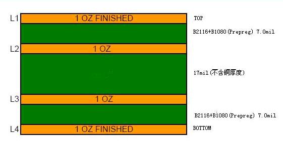 以下是我司生產(chǎn)的一種板件,該板的要求:4層板,完成板厚1.0±0.10mm,板材采用FR4,客戶有指定的疊層結(jié)構(gòu),見(jiàn)下圖