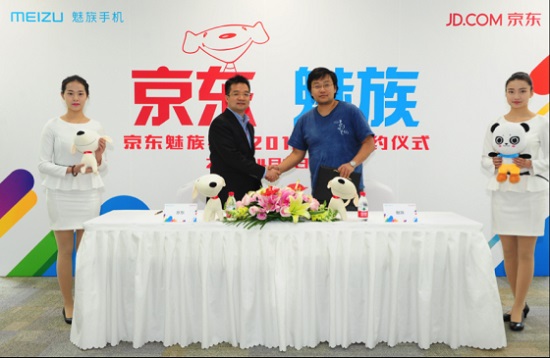 魅族科技副總裁李楠(右)與京東3C事業部總裁胡勝利簽署協議 4月6日,2016京東3C戰略發布會在北京隆重舉行,會上,京東3C事業部總裁胡勝利宣布,16年,京東3C將打造百億級品牌8家。4