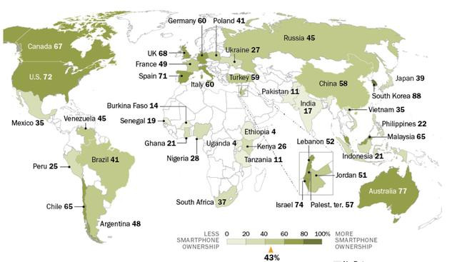 據(jù)美科技媒體Mashable近日引述皮尤機(jī)構(gòu)的一份報(bào)告稱,發(fā)展中家的智能手機(jī)普及率已經(jīng)增加到了37%。